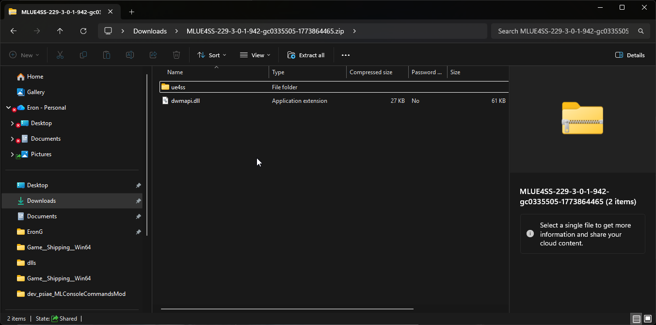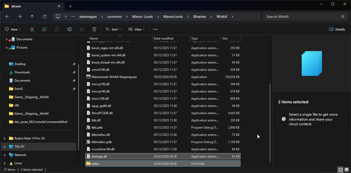 Here we have the dwmapi.dll file and ue4ss folder, we need these two files.